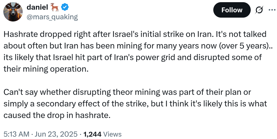 Після цього 22 червня страйк США по іранських ядерних установах, що, за даними Reuters, також призвело до відключення електричної мережі. Це співпало з 1% падінням глобального хашрата з 869,9 год 21 червня до 860,9 год/с.
