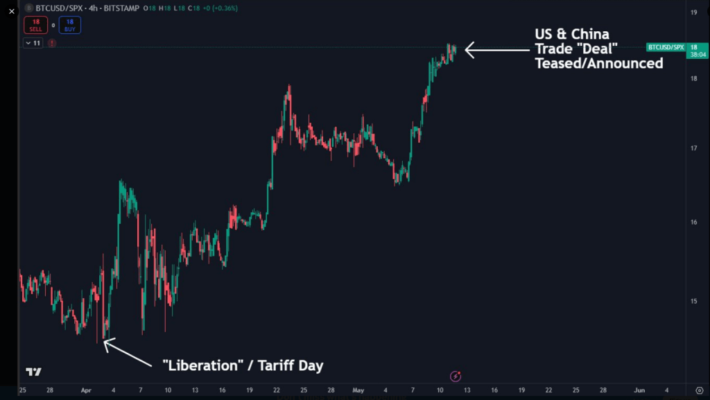 Ціна біткойна зросла близько 25% з 2 квітня, навіть коли великі індекси акцій знизилися. Цифрова валюта пробила 104 000 доларів до 12 травня. Традиційні ринки, такі як S&P 500, були в червоному одночасно. Виходячи з ринкових даних, стійкість Bitcoin виділялася перед розпродажами та тарифними переговорами.