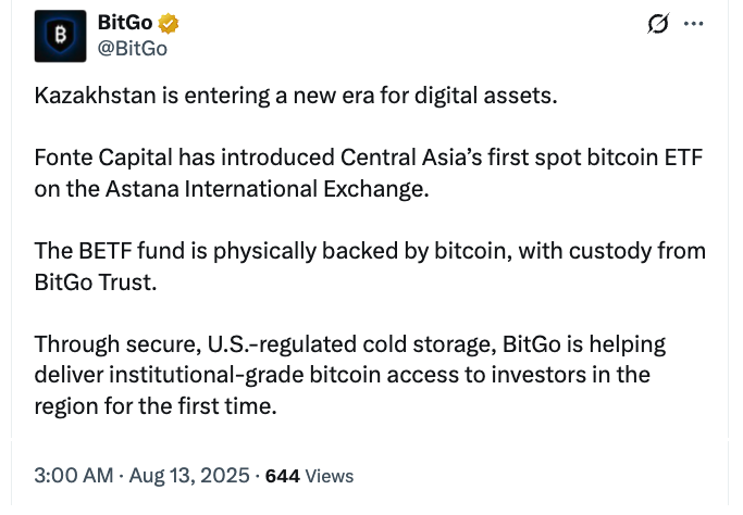 Участь Bitgo у Fonte Capital, що випускається Bitcoin ETF, вперше відзначає платформу для забезпечення доступу до біткойна інституційного класу до інвесторів у Центральній Азії, йдеться у повідомленні про X.