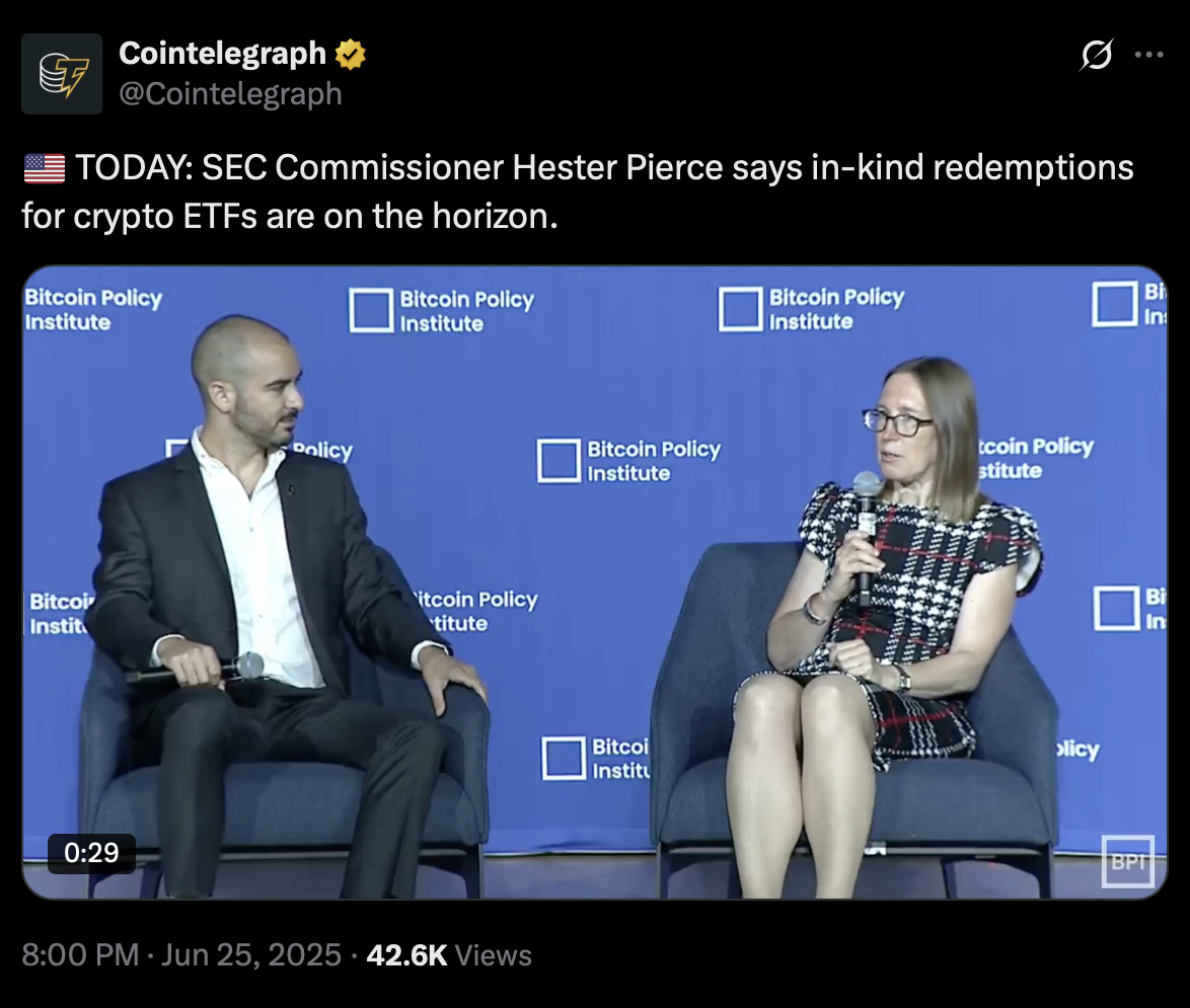 У лютому SEC домагався коментарів щодо пропозиції щодо дозволу на натуральні творіння та викупи для Spot Bitcoin (BTC) та ETHER (ETH) ETF. Під час колегії в Інституті політики біткойна в середу комісар з цінних паперів та обміну (SEC) Гестер Пірс заявив, що в натуральних викупах для криптовалют ETF є на горизонті.