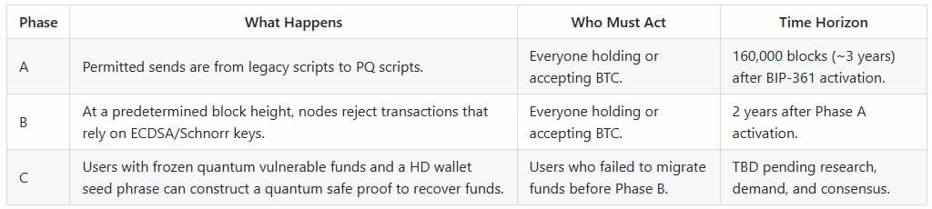 Існує також вікно безпеки, коли квантово-вразливі транзакції все ще можуть бути дозволені після п’ятирічної позначки, запропонованої в BIP-361, але з блокуванням виходів на певний період.