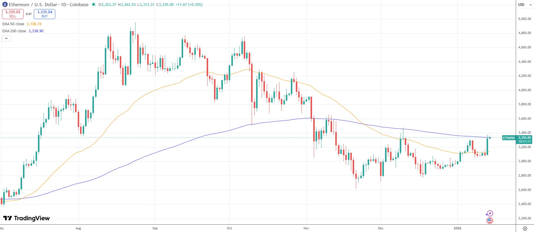 За даними TradingView, на початку торгів у середу на Coinbase вартість активу досягла 3375 доларів, що є найвищим рівнем з 10 грудня.