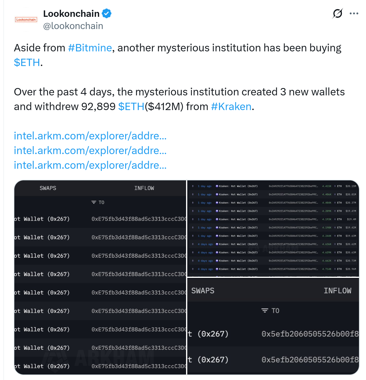 Додавши до покупки, невстановлений кит тихо зібрав 92 899 ETH, близько 412 мільйонів доларів, за останні чотири дні. Суб’єкт господарювання встановив три свіжі гаманці перед тим, як вилучити кошти з Кракена, пропонуючи навмисну стратегію довгострокового зберігання.