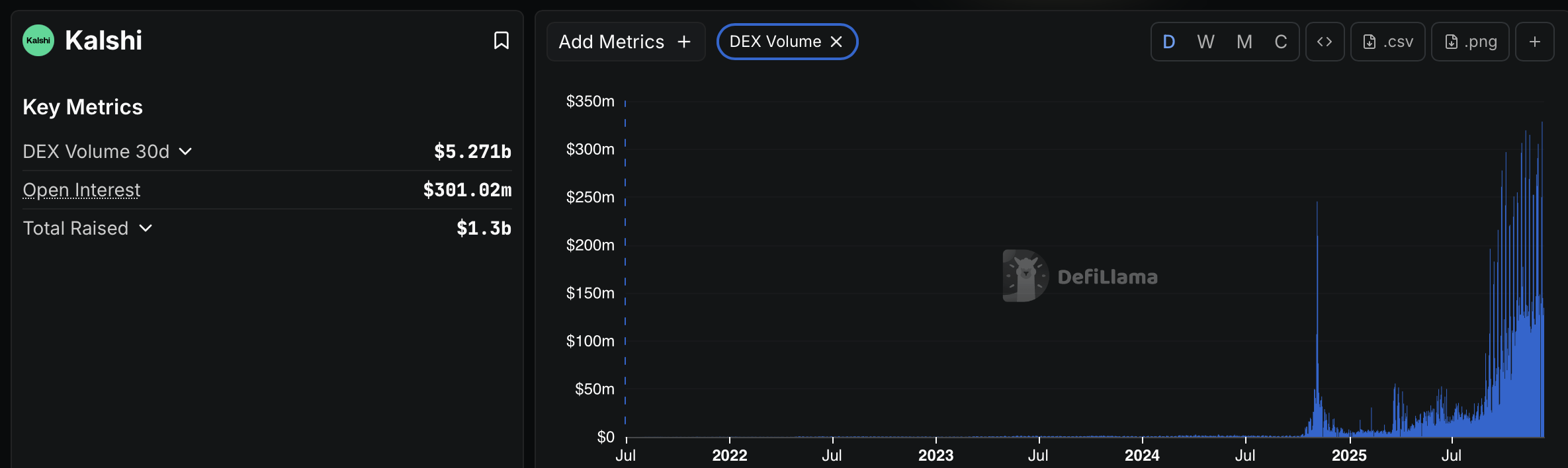 Ринки прогнозів стали основною тенденцією у 2025 році. Згідно з даними DefiLlama, ринок прогнозів Kalshi згенерував обсяг торгів на 5,27 мільярда доларів США за останні 30 днів, тоді як Polymarket, заснований на блокчейні, зафіксував трохи менше 2 мільярдів доларів США за той самий період часу.