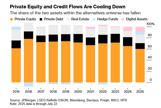 “В рамках альтернативних класів активів цифрові активи та хедж -фонди в цьому році спостерігають прискорення припливу, на відміну від слабкого збору коштів, що спостерігаються в приватному капіталі та приватному кредиту”, – заявив Bloomberg JPMorgan’s Thelows Nikolaos Panigirtzoglou.