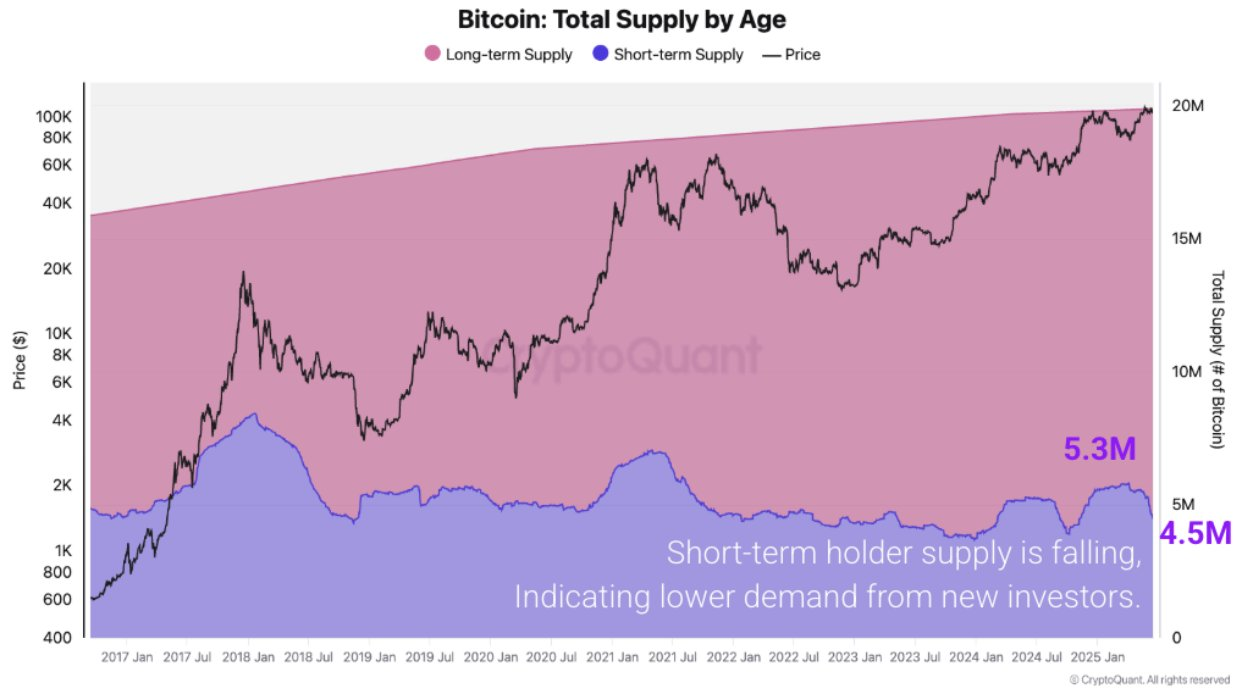 Коротко короткотермінової власниці біткойна впала лише на 4,5 мільйона BTC, що знизилося понад 800 000 BTC від утримання 5,3 мільйона BTC, що сигналізує про те, що “нові гроші висихають у біткойн”, згідно з повідомленням п’ятниці з платформи Analytics Cryploquant.