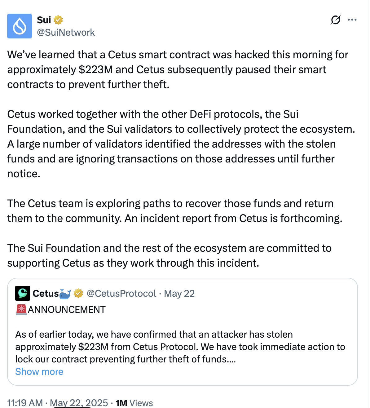 163 мільйони доларів з 223 мільйонів доларів були заморожені валідаторами та партнерами з екосистеми в той же день, що й хак, повідомляє команда Cetus.