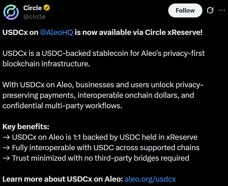 Circle та Aleo оголосили у вівторок, що USDCx на Aleo тепер доступний через xReserve від Circle, резервну модель емісії, яка дозволяє представляти USDC (USDC) у додаткових блокчейнах, не покладаючись на сторонні мости.