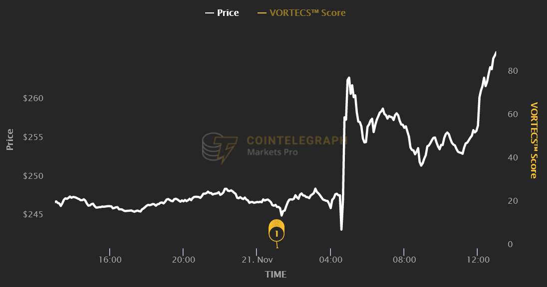Cointelegraph Markets Pro показує, що BNB зріс на 6% до 262 доларів приблизно за 30 хвилин після звіту Bloomberg від 20 листопада, у якому говориться, що Binance веде переговори щодо угоди щодо вирішення розслідування Міністерства юстиції щодо ймовірних порушень санкцій, відмивання грошей і шахрайства.