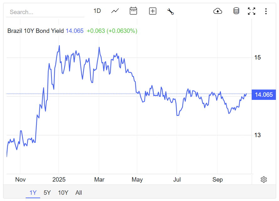 За даними Tradingeconomics, 10-річна прибутковість урядової облігації Бразилії становить приблизно 14%, після того, як нещодавно досягнув близько 15,2%. Це зробило Бразилію однією з найпривабливіших суверенних ринків облігацій у всьому світі, хоча іноземні інвестори часто стикаються з бюрократією, складними правилами податків та перешкодами валюти, коли намагаються безпосередньо інвестувати.