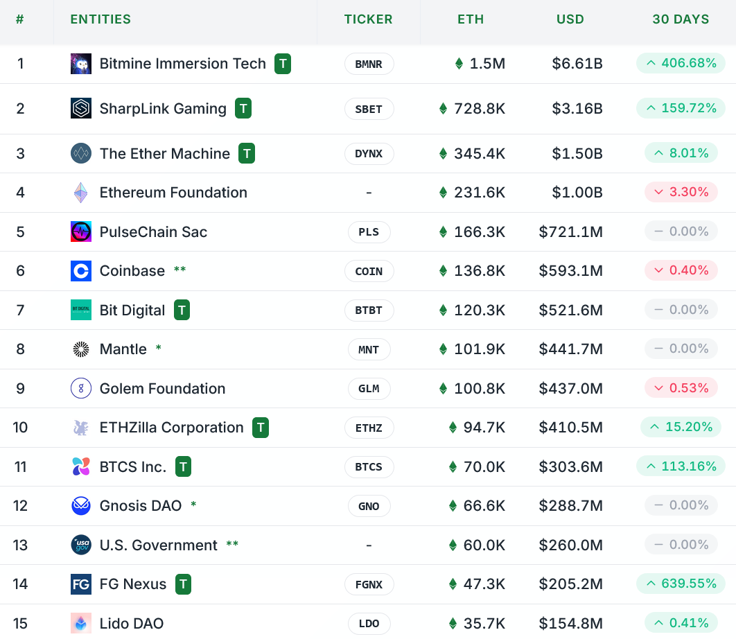 Ігри Bitmine Immersion Tech та Sharplink ведуть гонку, з 1,5 мільйонами ETH та 728 800 ETH відповідно, тоді як BTCS становить 11 -е місце на 70 000 ETH на суму понад 303 мільйони доларів, показують дані стратегетів.