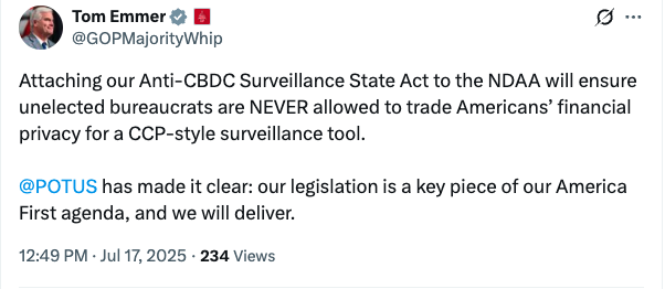 Еммер знову ввів версію законопроекту в нинішньому конгресі, і республіканці підтримали зусилля як узгодження з виконавчим розпорядженням президента Дональда Трампа у січні, що забороняє CBDCS.