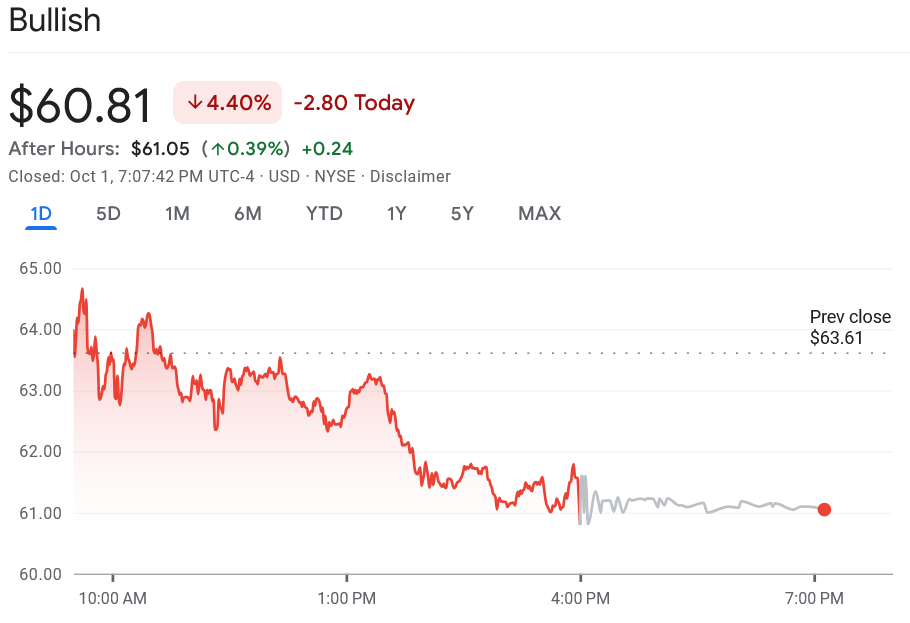 Незважаючи на новини, акції бичачих (BLSH) впали на 4,4% до 60,80 доларів протягом торгових годин у середу, показують дані Google Finance.