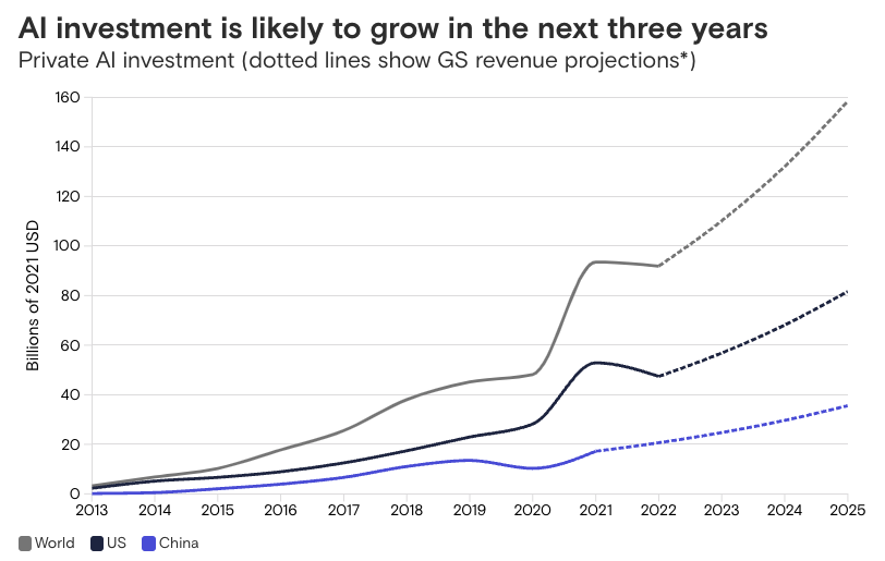 У звіті про інвестиції від 1 серпня економісти Goldman Sachs Джозеф Бріггс і Девеш Коднані передбачили, що штучний інтелект може залучити до 200 мільярдів доларів глобальних інвестицій до 2025 року — половина з них у Сполучених Штатах — сприяючи збільшенню валового внутрішнього продукту (ВВП).