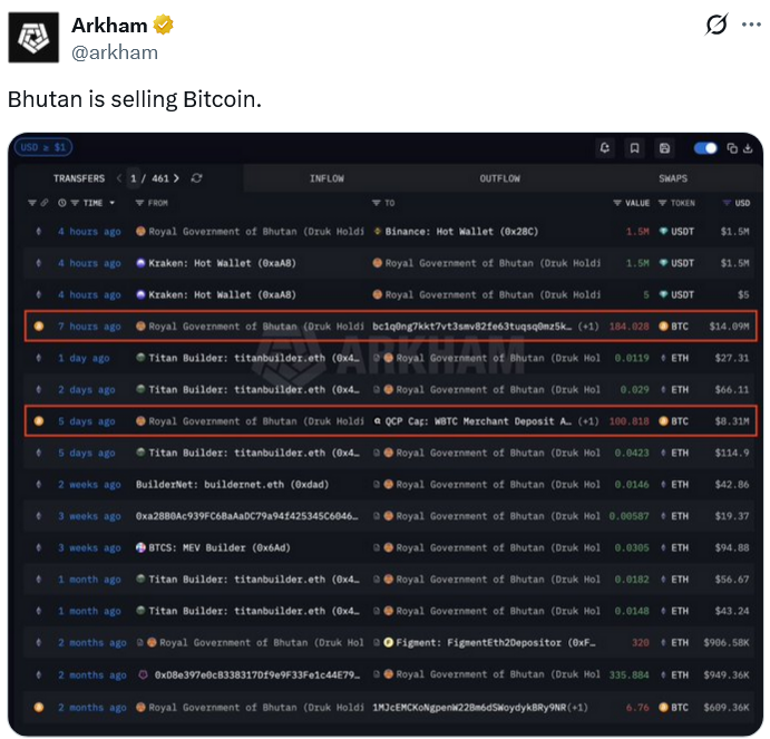 Хоча точна причина розпродажу не ясна, Аркхем зазначив, що Бутан періодично продає біткойни порціями приблизно на 50 мільйонів доларів, причому останній період великих продажів припадає на середину-кінець вересня 2025 року.