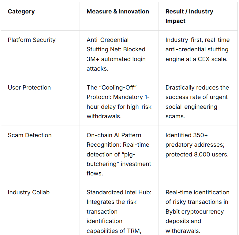 Bybit повідомляє, що система також виявила 350 адрес шахрайства з інвестиціями з високим ризиком, які захистили 8000 користувачів від потенційних збитків протягом попереднього кварталу. Він також запобіг понад трьом мільйонам атак хакерів із підкиданням облікових даних протягом 2025 року.