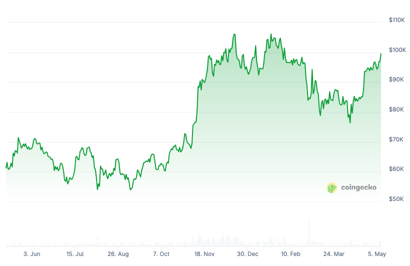 Біткойн (BTC) відремонтував позначку в розмірі 100 000 доларів 8 травня о 15:22 UTC, що зростає на 4,2% від внутрішнього мінімуму – 95 967 доларів, згідно з даними Coingecko.