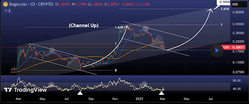Технічний аналіз показує, що Dogecoin рухається в рамках схеми вгору каналу протягом останнього року. Ця закономірність характеризувалася повторним відскоком між рівнем опору та підтримки. Зокрема, поточна ціна показує Dogecoin поблизу нижньої межі цього каналу, де минулі відскоки викликали відновлення.