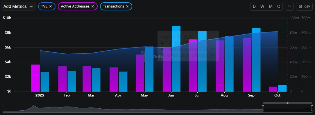 TLV Blockchain за останні 24 години збільшився на 2,5%, торкнувшись 8,23 мільярда доларів. У той же час кількість активних адрес зросла до 73,24 мільйона минулого місяця, досягаючи найвищого зафіксованого рівня.