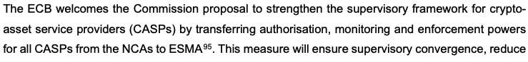 ЄЦБ заявив, що «передача повноважень щодо авторизації, моніторингу та примусового виконання для всіх CASP» від національних регуляторів до ESMA «забезпечить конвергенцію нагляду, зменшить фрагментацію та пом’якшить транскордонні ризики на ринках криптоактивів, таким чином підтримуючи фінансову стабільність і цілісність єдиного ринку».