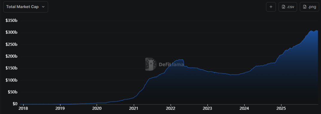 Згідно з даними агрегатора даних DefiLlama, ринкова капіталізація сектора продовжує зростати, починаючи з 2025 року на рівні близько 205 мільярдів доларів США і закінчивши рік на рівні 307 мільярдів доларів США.