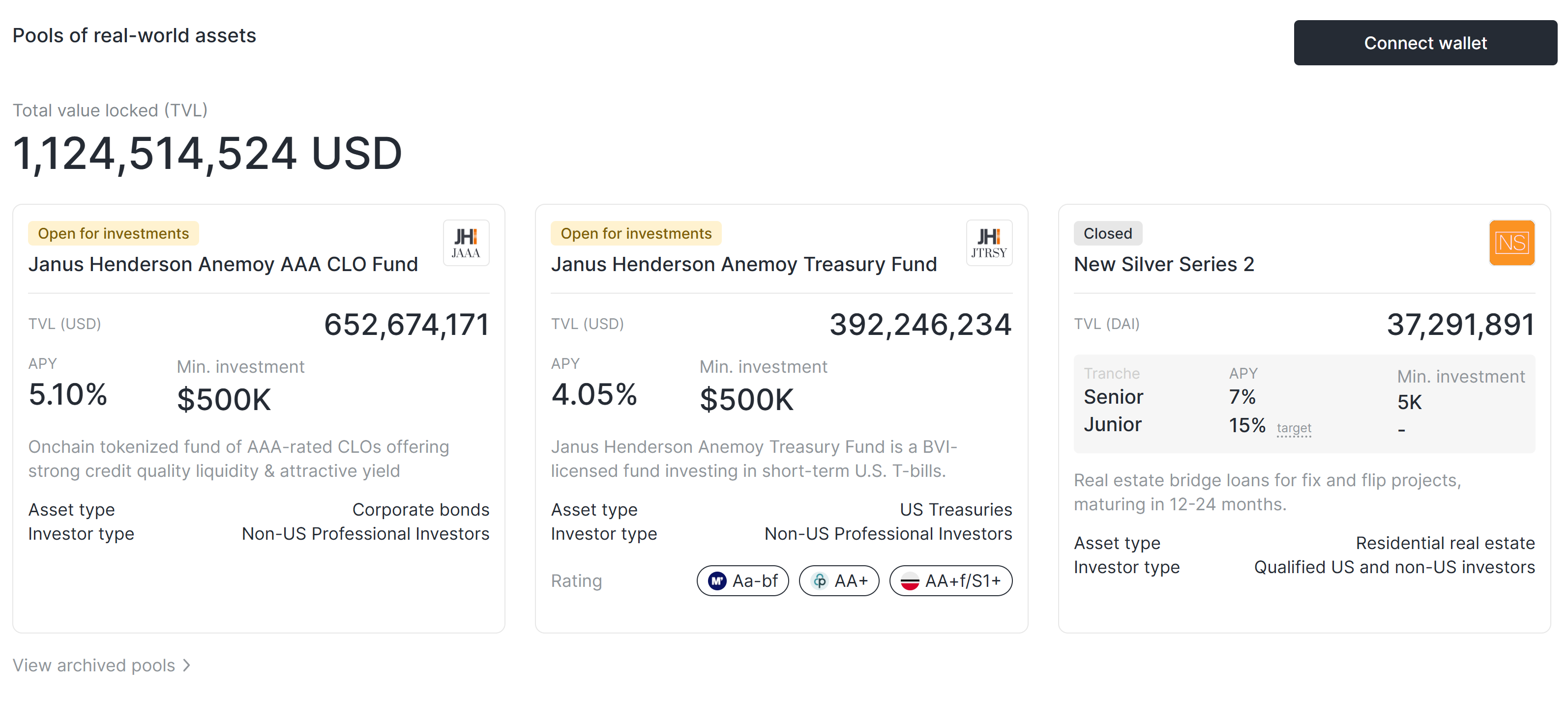 Трубопровід Centrifuge розділений між традиційними менеджерами активів за допомогою менеджера Anemoy Anemoy Anemoy та менеджерів Onchain-Native, які використовують свою RWA Launchpad. З боку попиту, StableCoins та продукція врожаю – це найбільші покупці, використовуючи RWAS для встановлення “підлоги врожаю” для резервів.