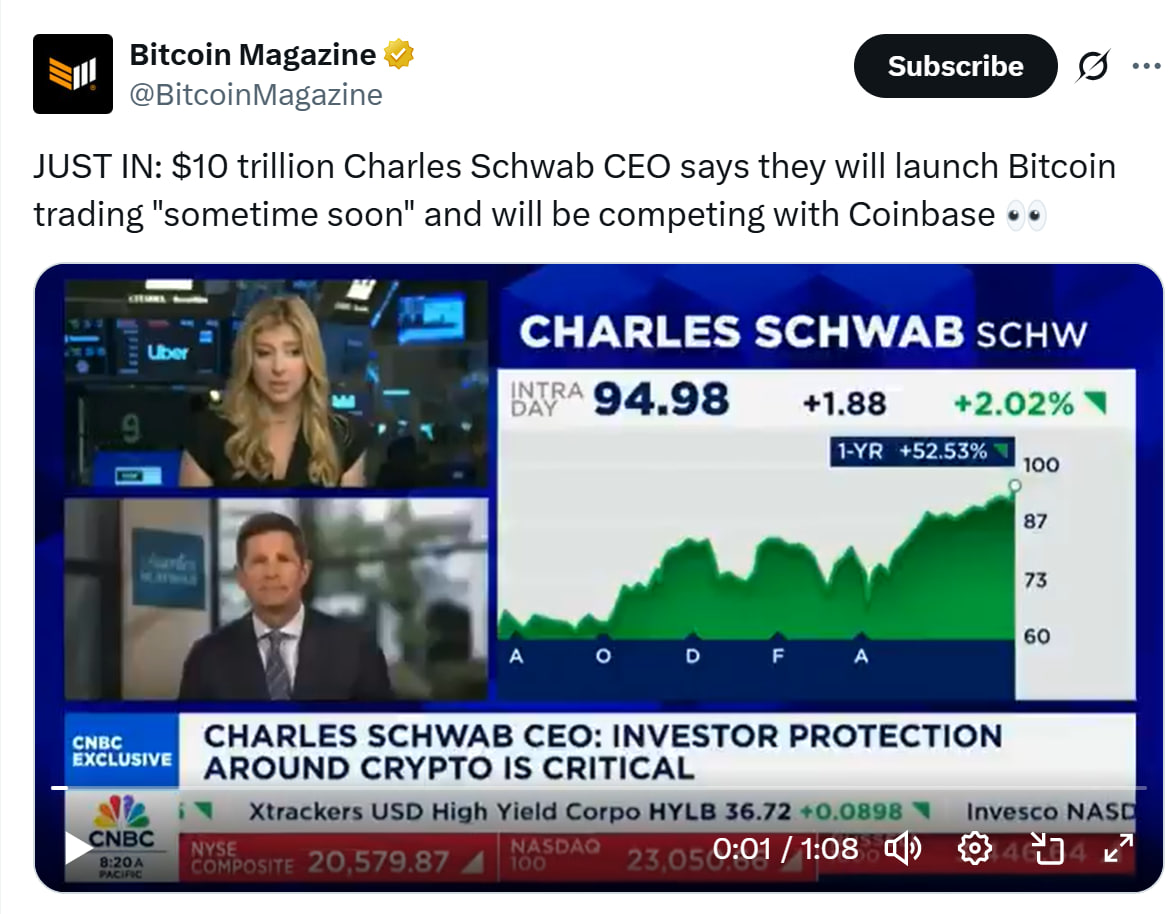 На початку цього року Вурстер заявив, що компанія очікує, що вікно запуску в квітні 2026 року надасть послуги торгівлі Bitcoin для клієнтів Schwab. У той час він назвав збільшення трафіку на 400% на веб -сайті криптовалюти Шваба як доказ інтересу інвесторів до цифрових активів.