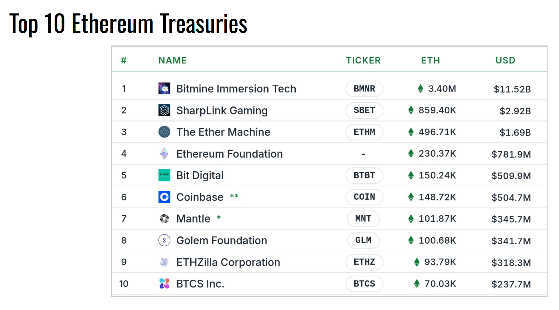 Згідно з даними CoinGecko, найбільшою казначейською компанією ETH є Bitmine, яка володіє 3 505 723, або майже 3% від загальної пропозиції Ether.