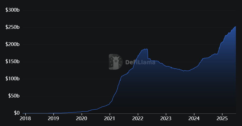Підвищення відбувається, коли сектор Defi відновлюється з ринку ведмедів 2022 року. У той час як загальна вартість заблокована (TVL) на платформах Defi значно відскочила від його мінімумів, вона все ще залишається нижче високих трьох років тому сектору.