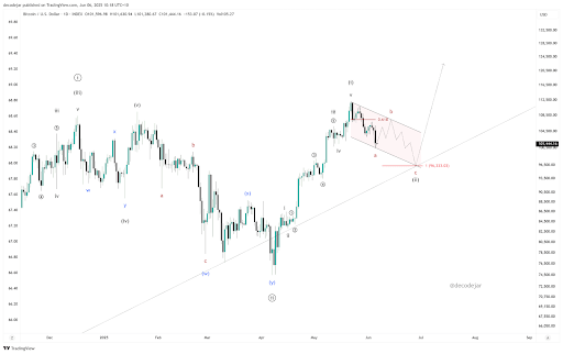 У пості X декод поділився супровідною діаграмою, в якій він зробив аналіз хвиль ABC поточної ціни на біткойн. Виходячи з його аналізу, очікується, що провідна криптовалюта знизиться нижче 100 000 доларів, перш ніж вона поступить до нового ATH в 120 000 доларів. Діаграма показала, що BTC може впасти до 96 500 доларів на корективному русі хвилі B.
