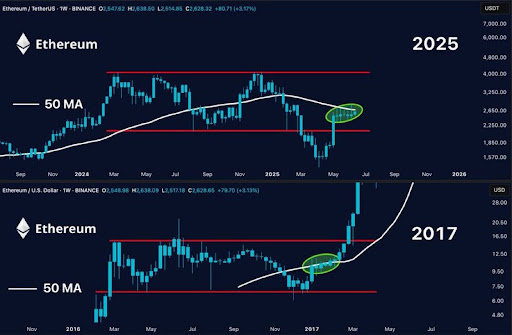 Цінова акція Ethereum показує неабияку схожість з його ринковим циклом 2017 року, аналітики вказують на майже ідентичну технічну установку та поведінку на ринку. Аналітик криптовалюти Мерлін Торговець, який поділився порівнянням щотижневого діаграми 2025 та 2017 років на X (раніше Twitter), припускає, що Ethereum зараз дотримується тієї ж схеми прориву, яка колись призвела до історичної мітингу. Цього разу, однак, аналітик вважає, що цей крок може бути ще більш значущим.