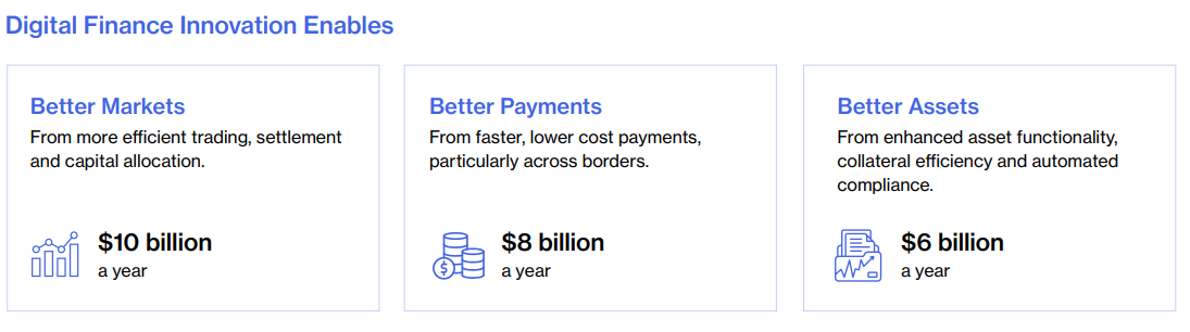 «Майже половина економічної вигоди, пов’язаної з активами, виникає завдяки активізації кредитування під заставу, РЕПО та ринків фінансування рахунків-фактур на токенізованих рейках, де смарт-контракти автоматизують управління заставою, нарахування маржі та розрахунки», — йдеться у звіті.