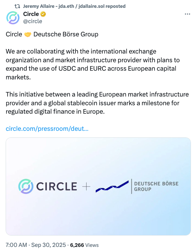 Deutsche Börse Group та Circle Internet Group підписали меморандум про інтеграцію стабільців Circle в інфраструктурі фінансового ринку Deutsche Börse, згідно з спільним оголошенням у вівторок.
