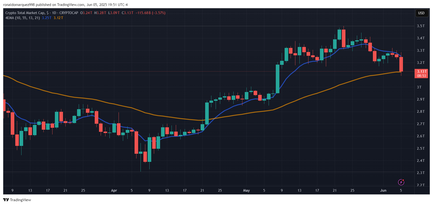 КолаЩоденна діаграма показує загальну капіталізацію ринку з 3,30 трлн до 3,12 трлн доларів у четвер. Джерело: Всього на TradingView.com