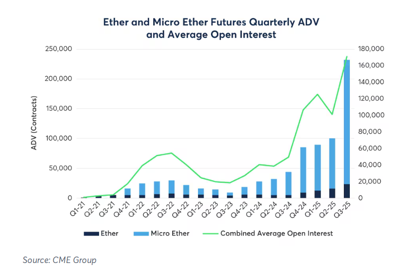 Квартал завершився рекордним середнім щоденним відкритим інтересом у розмірі 31,3 мільярда доларів США за ф’ючерсними та опціонними контрактами CME. Це важливий сигнал, оскільки відкритий інтерес відображає кількість капіталу, який залишається активно спрямованим на ринок, а не лише короткостроковий торговий оборот. Зростання відкритого інтересу зазвичай вказує на більш глибоку ліквідність і більшу інституційну переконаність.