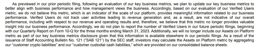 “Ми також розкрили – і продовжуємо розголошувати – більш релевантну метрику” щомісячних користувачів, що здійснюють трансакцію ” – кількість людей, які використовують нашу платформу в даному місяці”, – сказав він перед додаванням: