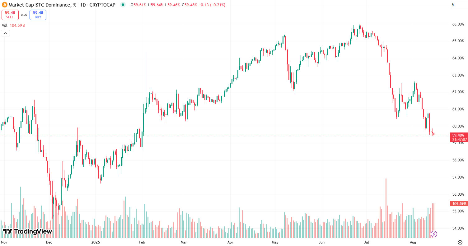 Домінування ринку біткойна знизилося приблизно на 10% з понад 65% у травні 2025 року до приблизно 59% до серпня 2025 року, “сигналізуючи про ранні стадії ротації капіталу в альткойни”, – написав Дуонг.
