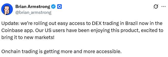 Coinbase розширює свою децентралізовану біржову торгову платформу під назвою «DeFi Mullet» на Бразилію, надаючи їм доступ до десятків тисяч токенів без необхідності виходити з програми Coinbase.
