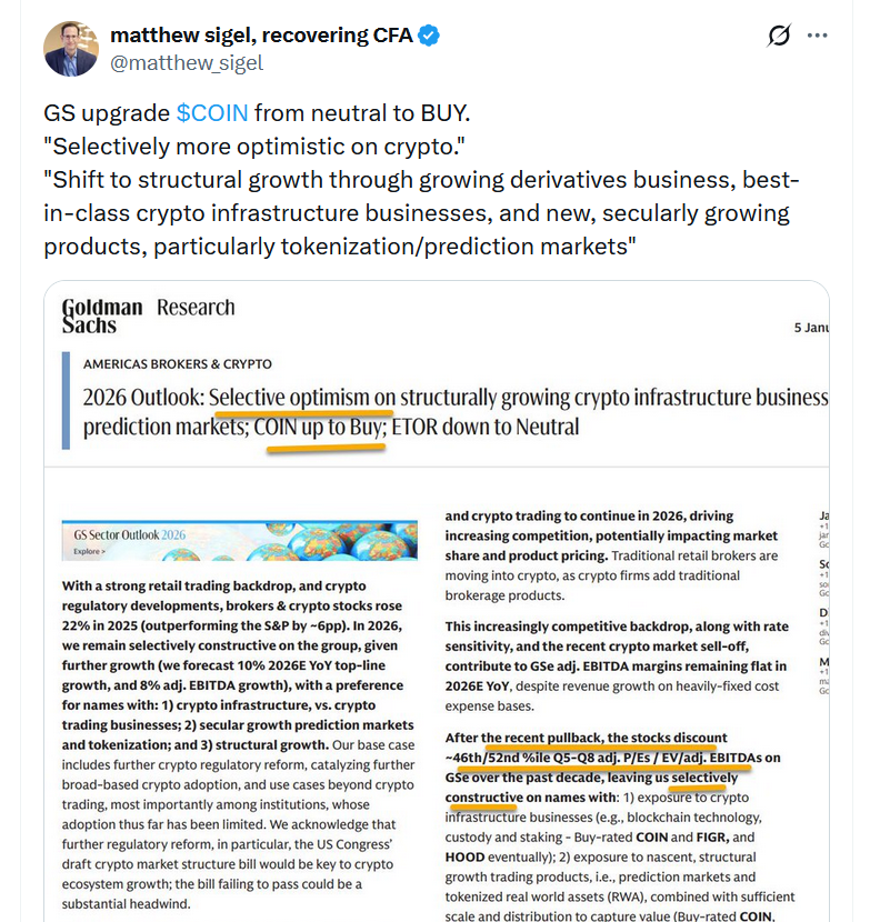 У звіті в понеділок аналітик Goldman Sachs Джеймс Яро сказав, що банк має «вибірковий оптимізм» щодо американських брокерів і «структурно зростаючих компаній криптовалютної інфраструктури», таких як Coinbase.