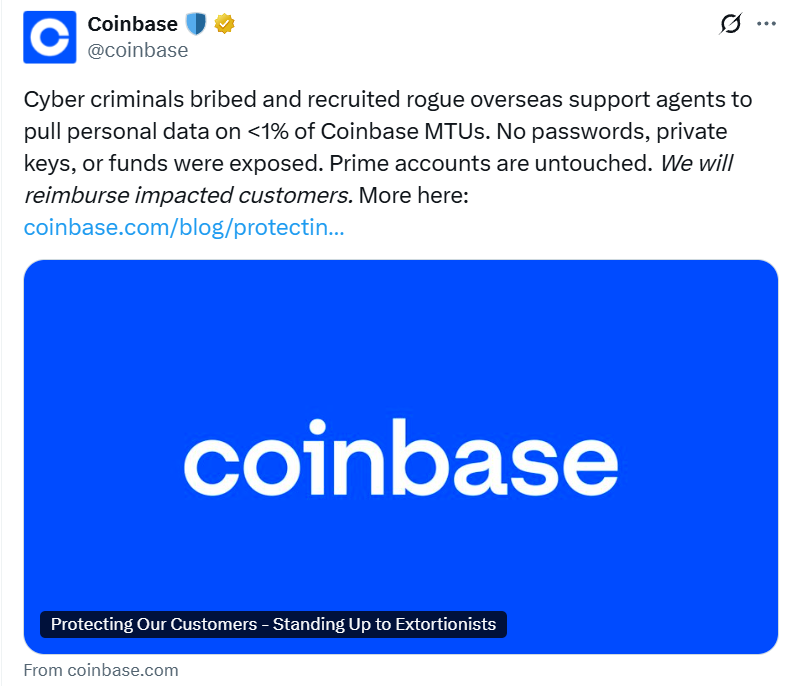 Після крадіжки даних, зловмисники “намагалися вимагати Coinbase за 20 мільйонів доларів, щоб покрити це”, яку біржа відмовилася.