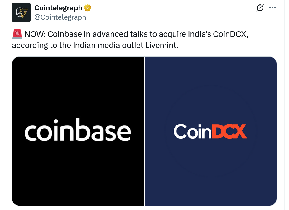 Як повідомляється, Coinbase знаходиться в “Розширених дискусіях” для придбання COINDCX, нещодавно зламаного індійського обміну криптовалютами, в якій він вже має частку, згідно з місцевим звітом новин.