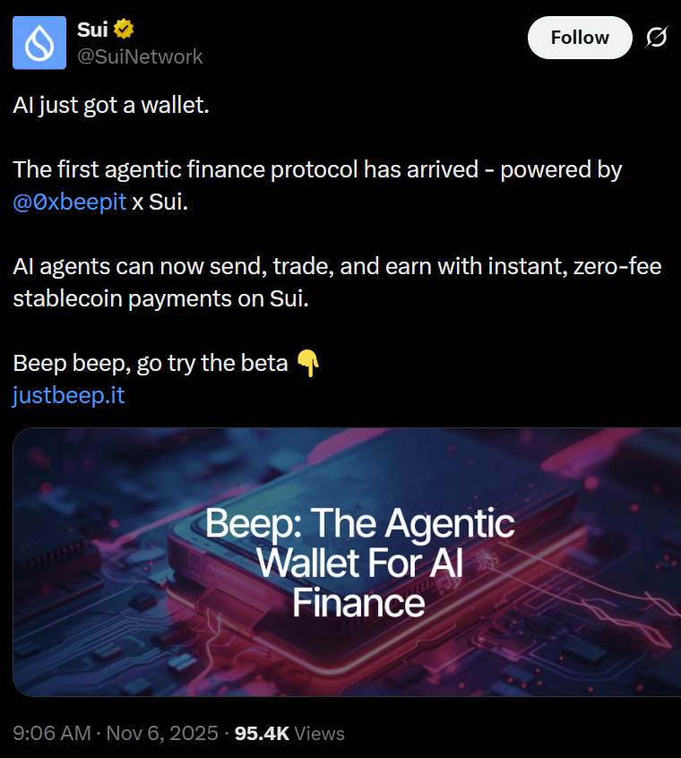 Тим часом агентський фінансовий протокол Beep нещодавно запустив гаманець у мережі Sui, що дозволяє агентам штучного інтелекту надсилати та отримувати платежі в стейблкойнах без комісії за транзакції.