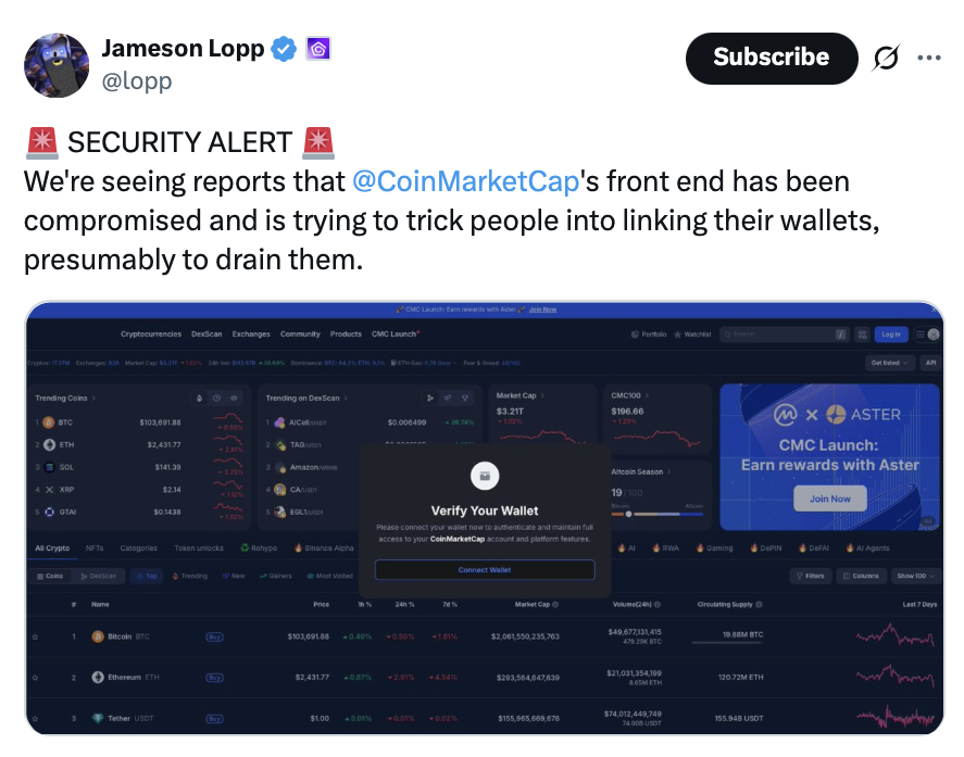 Як повідомляється, CoinmarketCap, веб-сайт для відстеження цін для криптовалют, на своєму веб-сайті вилучив на своєму веб-сайті, що спонукало користувачів перевірити свої криптовалютні гаманці, згідно з повідомленням на своєму офіційному обліковому записі X.