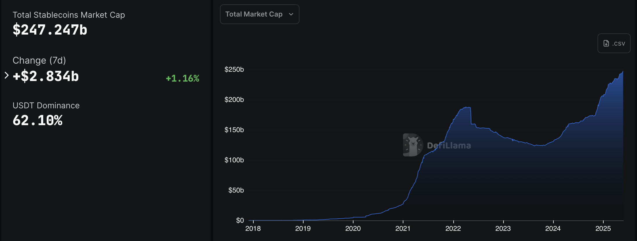 Стаблекоїни бачать посилене усиновлення. Згідно з Defillama Data, ринкова капіталізація стабільних досліджень досягла 247 мільярдів доларів 28 травня, що стрімке зростання від 161 мільярдів доларів за рік до цього. За останні 12 місяців ринкова шапка підскочила на 54%.