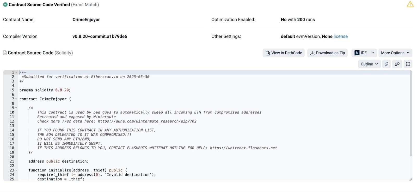 Кодекс Wintermute, який отримав назву “Crimeenjoyor”, друкує попередження в рамках зловмисних контрактів Ethereum, які “розроблені для автоматичних коштів” з гаманців з просоченими приватними клавішами, йдеться у пості 30 травня.
