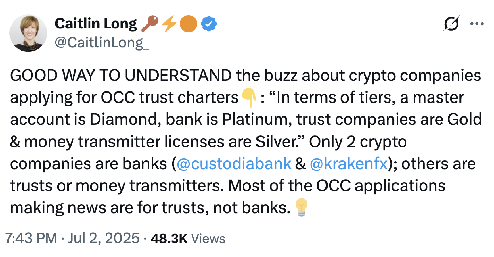 «З точки зору рівнів, головний обліковий запис — Diamond, bank — Platinum, трастові компанії — Gold, а ліцензії на переказ грошей — Silver», — сказав засновник і генеральний директор Custodia Bank Лонг у дописі X у липні, додавши, що Custodia та Kraken є «лише двома криптовалютними компаніями», які є банками.