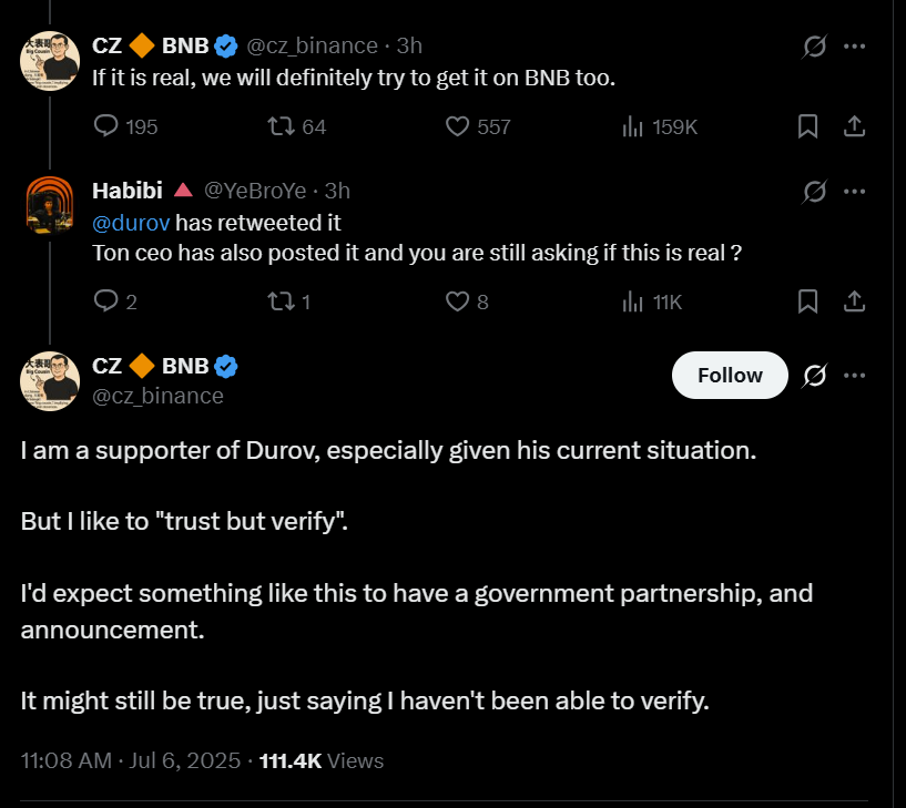 У відповідь на повідомлення CZ, деякі користувачі X зазначили, що генеральний директор Telegram Pavel Durov підтвердив цю новину. Дуров повторно оголосив оголошення про X від криптовалюта криптовалюта.