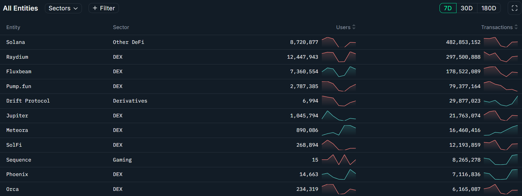 Подібно до Avalanche, Dex Trading керував більшістю активності blockchain, включаючи Raydium Dex з 12,4 мільйонами користувачів та 297 мільйонами транзакцій, а потім – Fluxbeam Dex з 7,3 мільйонами користувачів та 178 мільйонами транзакцій.