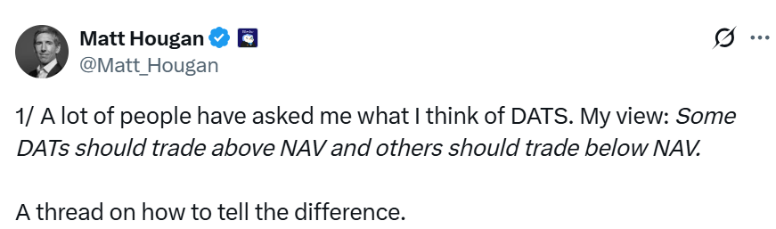 Один із найкращих способів визначити, чи варто дивитися на скарбницю цифрових активів (DAT), — це поставити запитання: «Вони роблять щось важке?»Хоуган сперечався в дописі X у середу.