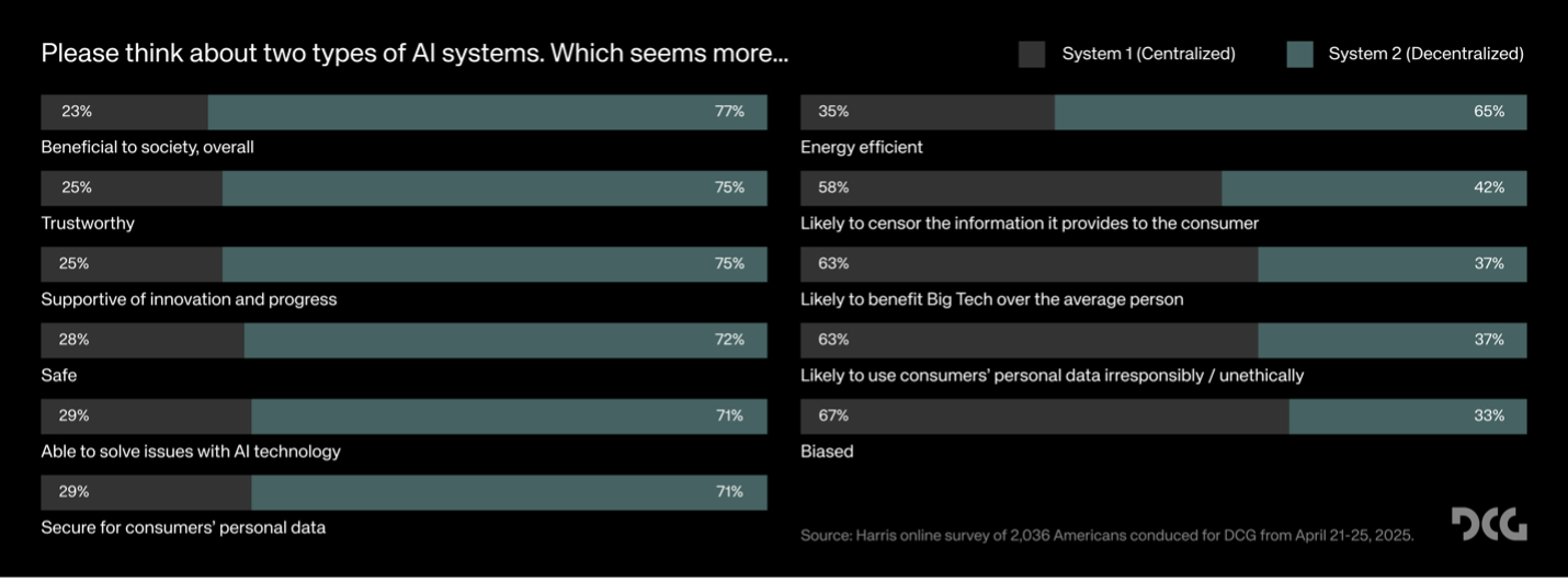 Зокрема, 67% респондентів сказали, що централізований ШІ, ймовірно, більш упереджений, а 63% заявили, що вважають, що централізований ШІ швидше за все, що користується великим технологічним компаніям, а не середній особі, і що, швидше за все, зловживають даними користувачів.